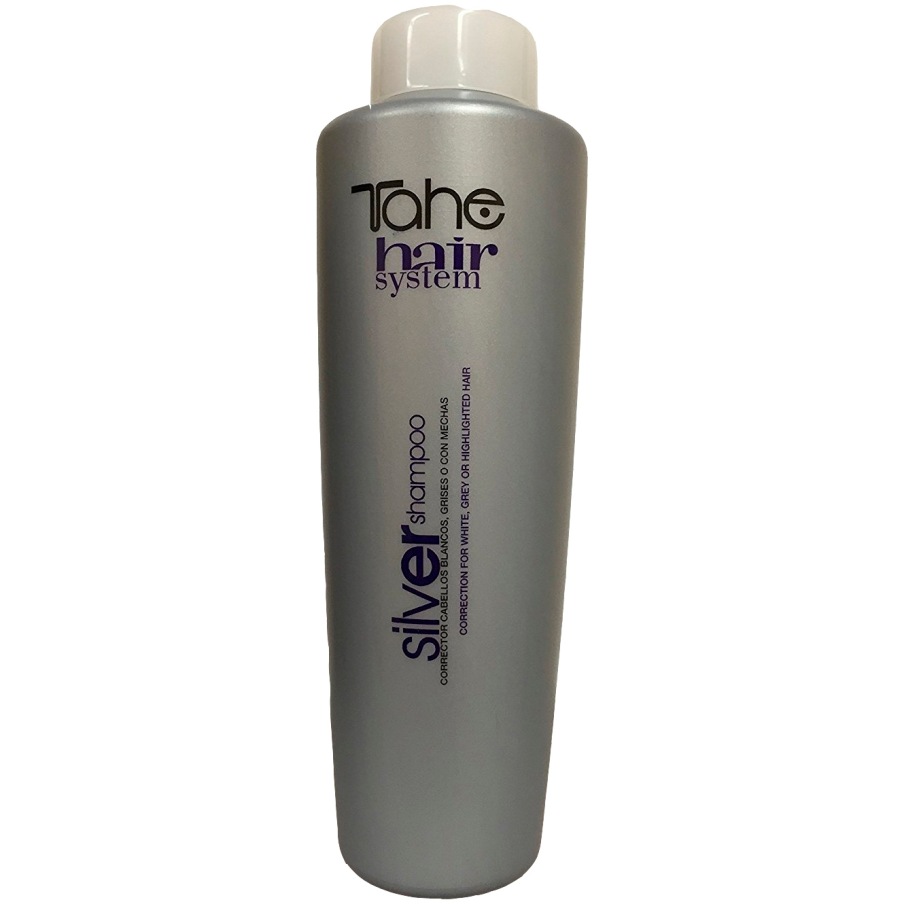 Tahe Hair System Silver Shampoo для білого, сірого або освітленого волосся. Шампунь прекрасно коригує тон білого, русявого, сивого, мелірованого волосся, позбавляючи його небажаних жовтих відтінків. System Silver шампунь підходить для всіх типів волосся.